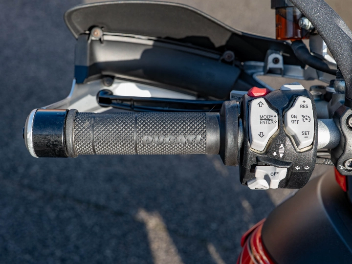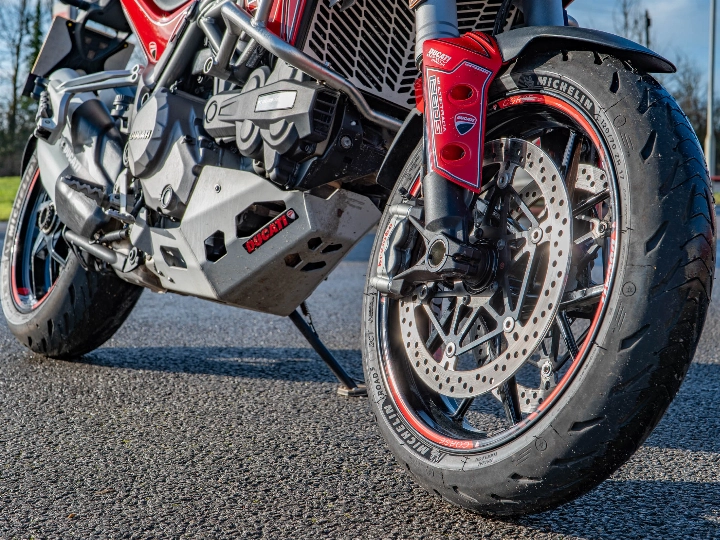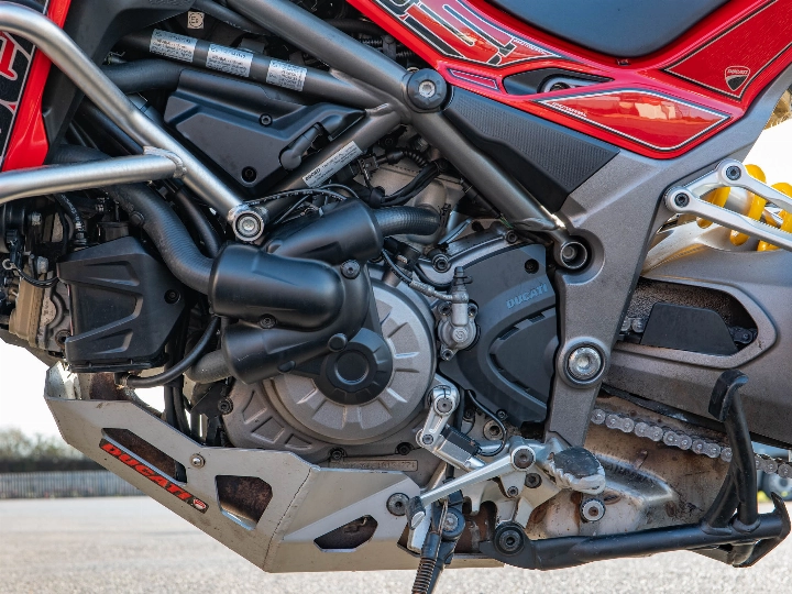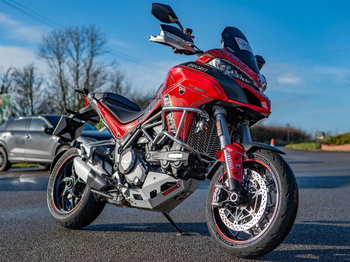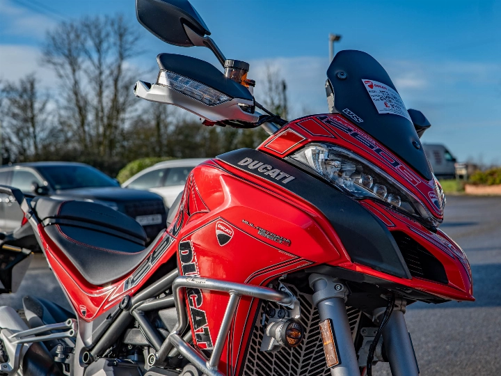 The specification on this particular Multistrada is incredibly high, featuring an array of functional and protective upgrades that make it ready for serious touring. It is equipped with genuine Ducati engine protection bars, a radiator guard, and a sump guard to shield the bike from road debris. For all-weather capability, it features heated grips and integrated spotlights to enhance visibility during night riding. The bike also sports a custom sticker kit that adds a unique aesthetic touch, complemented by a centre stand for easy maintenance. Standard touring features like cruise control and hand guards make long-distance journeys a pleasure rather than a chore.
