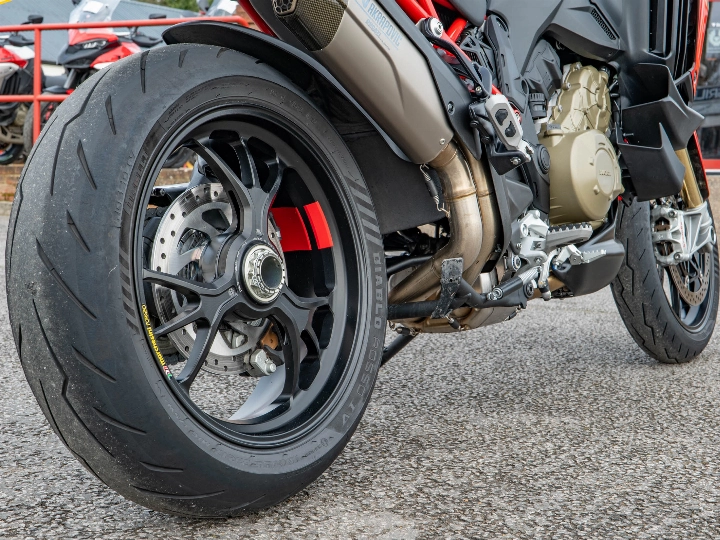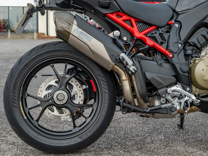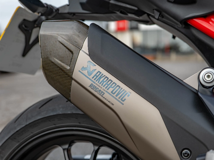 The heart of this machine is the 1,158cc V4 Granturismo engine. Tuned for a massive 170 hp and 125 Nm of torque, it provides an endless wave of power that is as smooth as it is relentless. This specific example has been significantly upgraded with a full Akrapovič exhaust system, which not only amplifies that visceral V4 soundtrack but also shaves weight and sharpens the 170 hp power delivery. Unlike other Multistradas, the Pikes Peak features a dedicated "Race" riding mode and a 17-inch front wheel paired with a single-sided swingarm, transforming the geometry for surgical precision on twisty B-roads.
