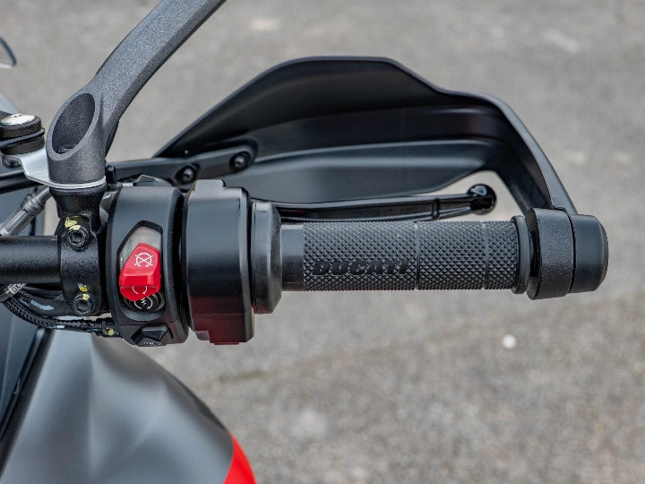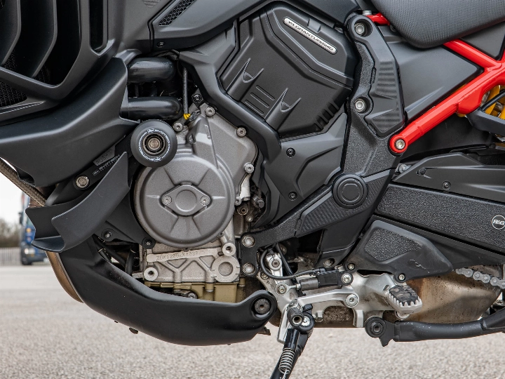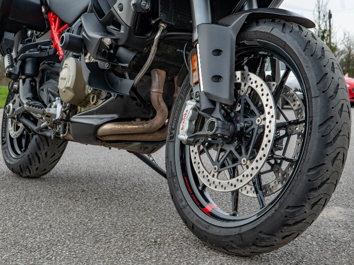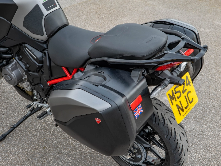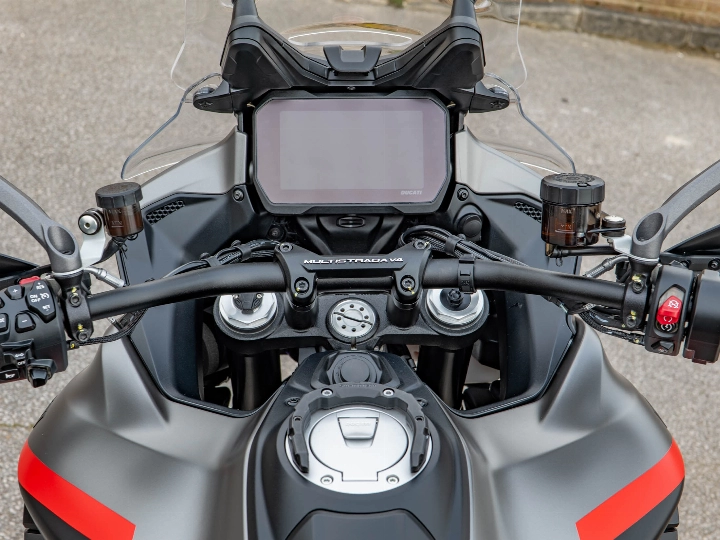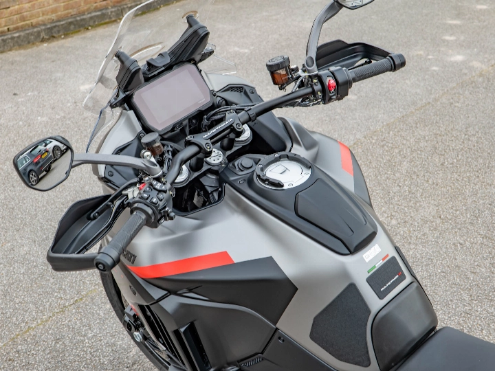 Riding the Multistrada V4 S Grand Tour is a transformative experience that balances supercar performance with armchair comfort. The 1158cc V4 Granturismo engine delivers a staggering 170 hp, providing effortless acceleration and a smooth, linear power delivery that makes light work of any mountain pass. The semi-active Ducati Skyhook Suspension constantly adjusts to the road surface, ensuring a plush ride whether you are riding solo or fully loaded with a passenger and luggage. The upright ergonomics and wide bars give you a commanding view of the road, while the electronic aids work silently in the background to provide a confidence-inspiring and relaxed journey.