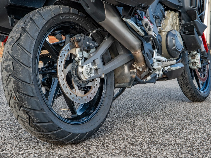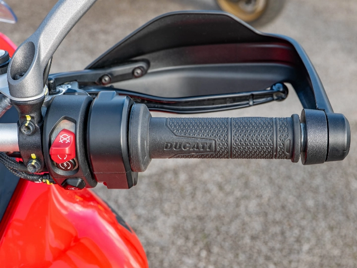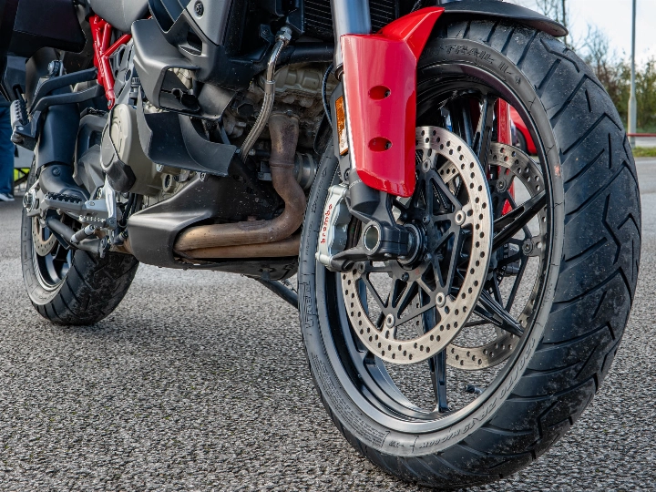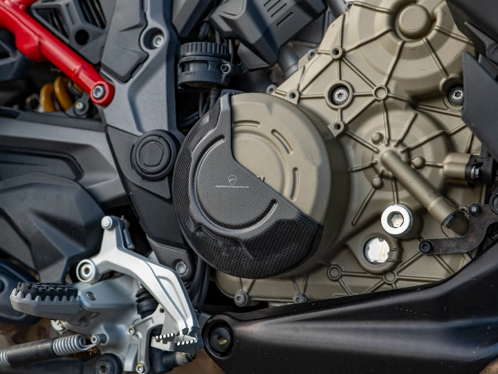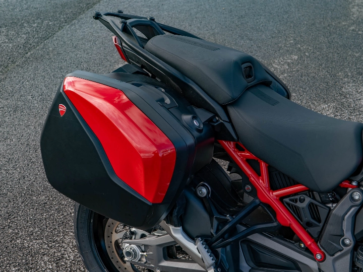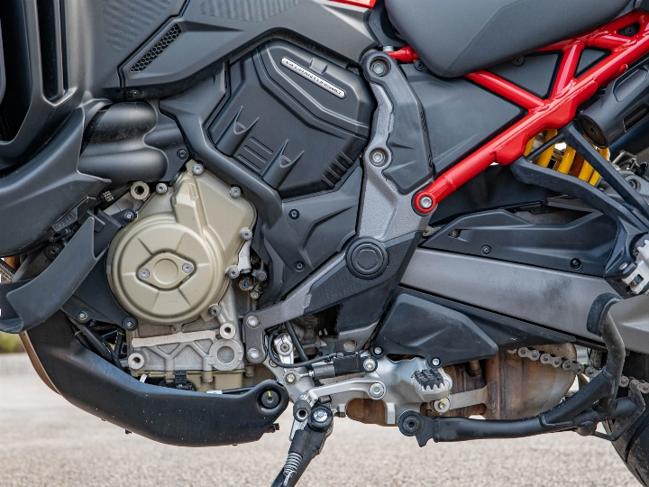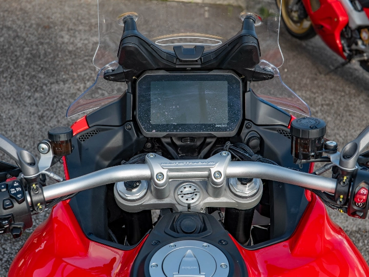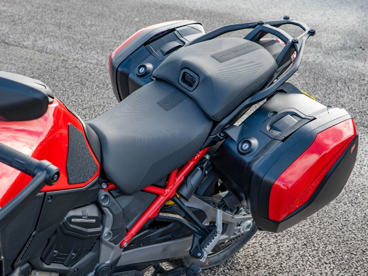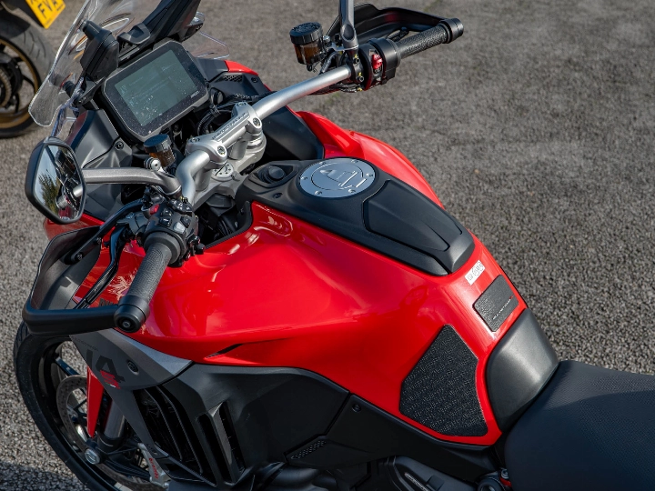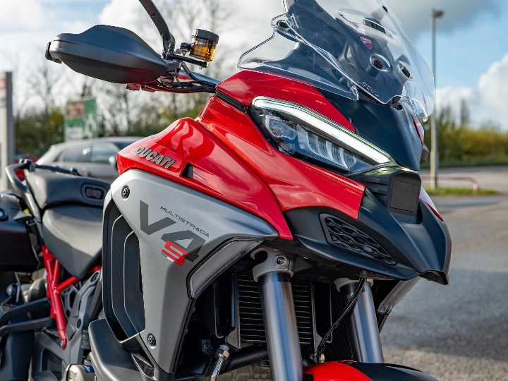 The Multistrada V4 S Sport is powered by the magnificent 1158cc V4 Granturismo engine, which delivers a commanding 170 hp through a six-speed manual transmission and the bi-directional Quickshifter (DQS EVO 2). The 'S Sport' model features the electronic Öhlins Smart EC 2.0 semi-active suspension and is typically distinguished by its sporty trim (though specified with the touring-focused Travel & Radar pack). The suspension includes the Automatic Lowering Device (ALD) for enhanced ease of use at low speeds.