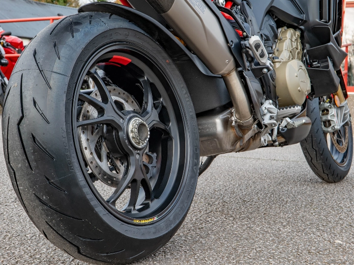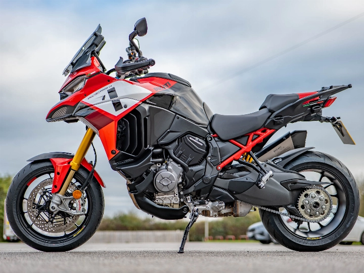 The Multistrada V4 Pikes Peak is propelled by the smooth and powerful, liquid-cooled 1158cc V4 Granturismo engine, which delivers a massive 170 hp through a precise six-speed manual transmission. This machine takes the Multistrada platform and elevates its sporting potential with racing components, including 17-inch forged aluminium wheels and fully adjustable Öhlins Smart EC 2.0 electronic suspension. This combination provides razor-sharp handling and track-ready precision, making it a serious contender in the performance adventure segment.
