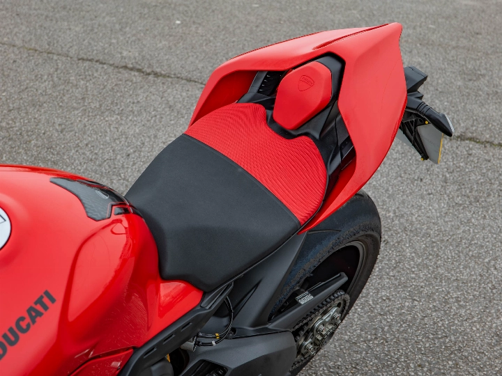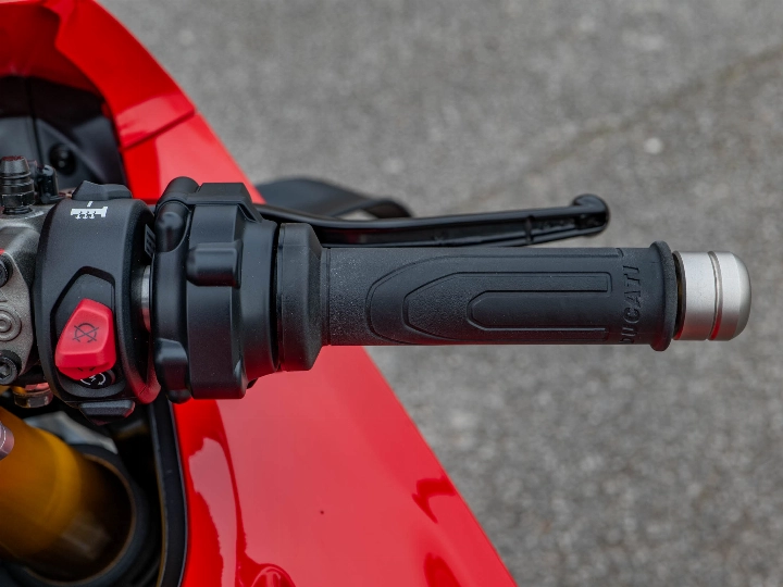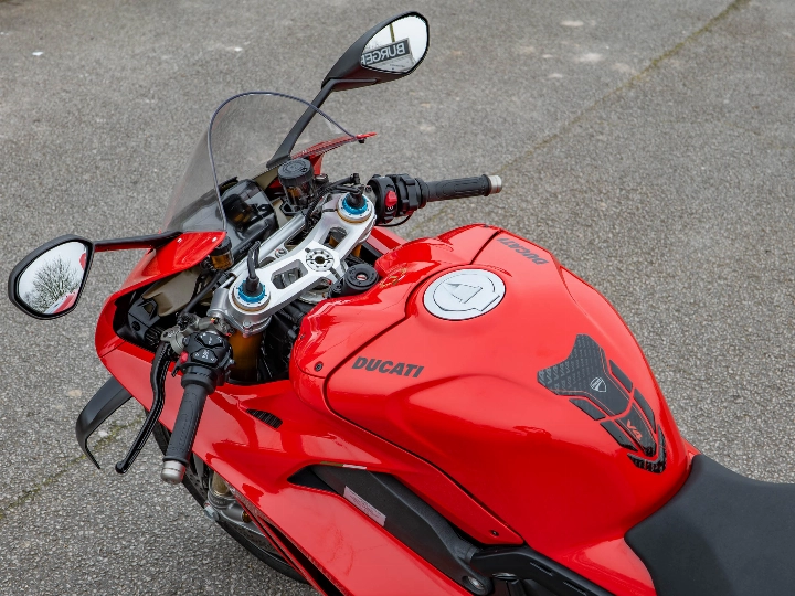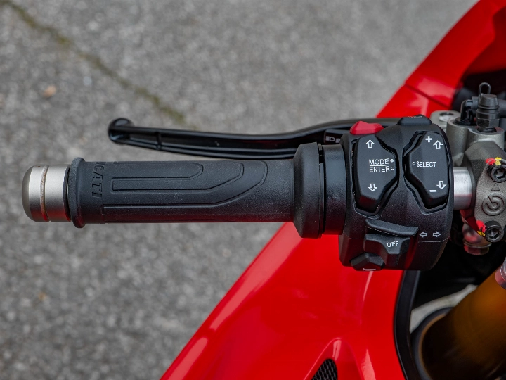 This particular Panigale V4 S has been subtly enhanced for both protection and comfort. It features a dedicated tank pad to preserve the flawless red paintwork and factory-fitted heated grips—a rare but welcome addition for early morning rides. Safety and security are paramount on a machine of this calibre; this example comes with a Datatool tracker and a 6-axis IMU managing a world-class electronics suite, including Cornering ABS, Traction Control, and Slide Control. The bi-directional quickshifter (DQS EVO 2) allows for seamless, lightning-fast gear changes that keep the 215.5 hp engine pinned in its powerband.