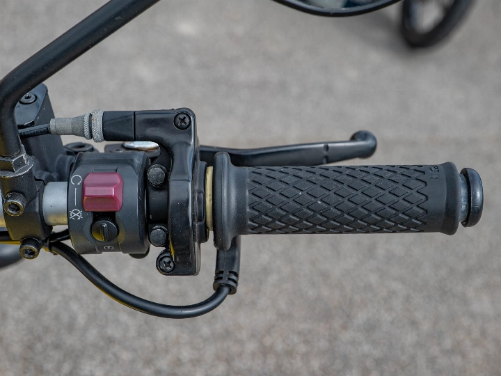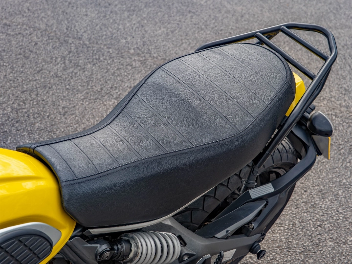 Riding the Scrambler Icon is an exercise in pure simplicity and agility, thanks to its wide handlebars and low centre of gravity. This bike has been enhanced with a comprehensive protection package, including Evotech crash bobbins, spindle sliders, and paddock stand bobbins, ensuring the 73 hp motor and chassis are well-guarded. The inclusion of a passenger grab rail adds extra versatility for two-up riding, while the under-seat storage and lightweight build make it a perfect companion for the urban commute.