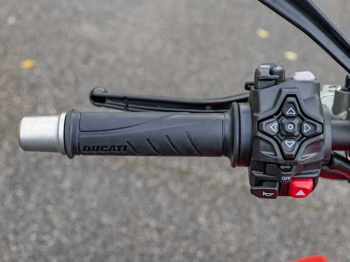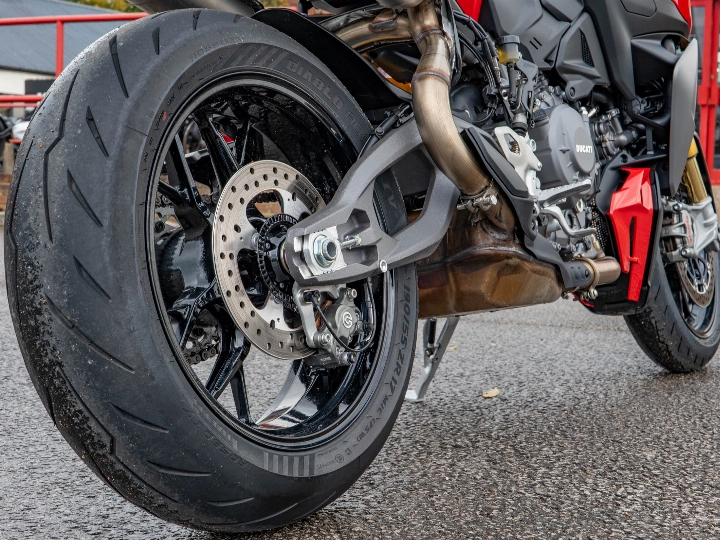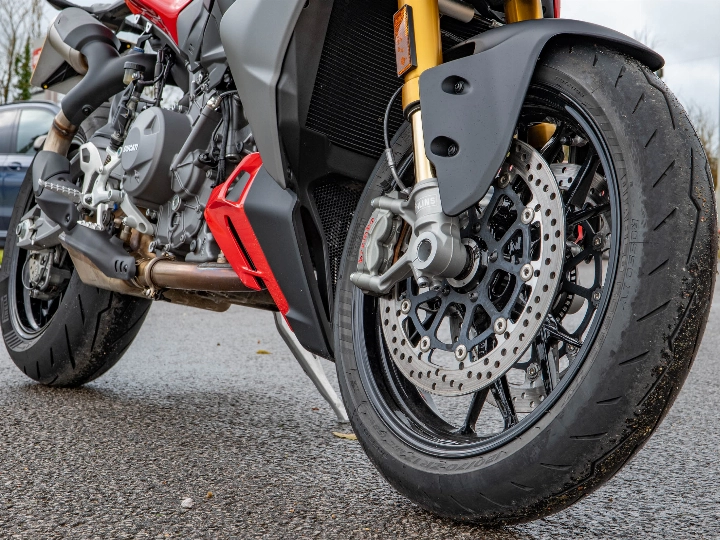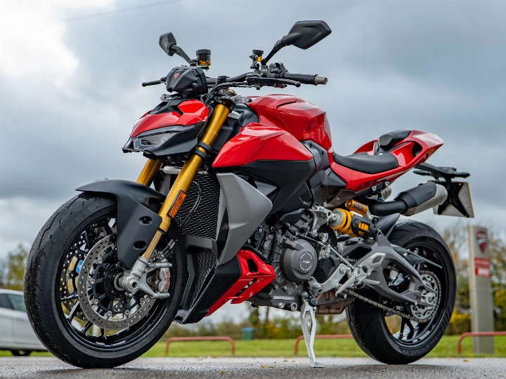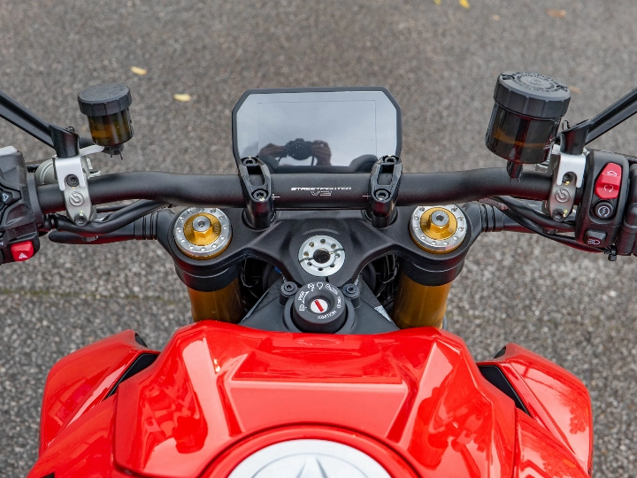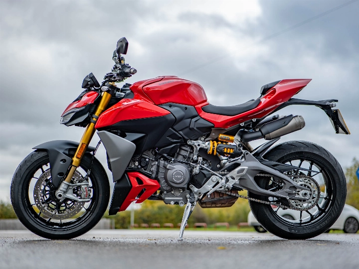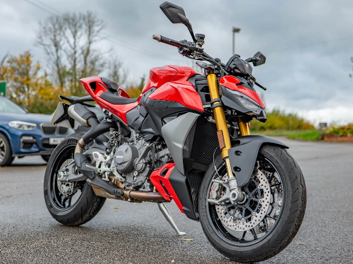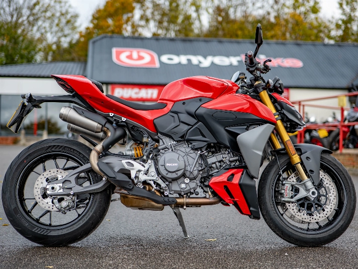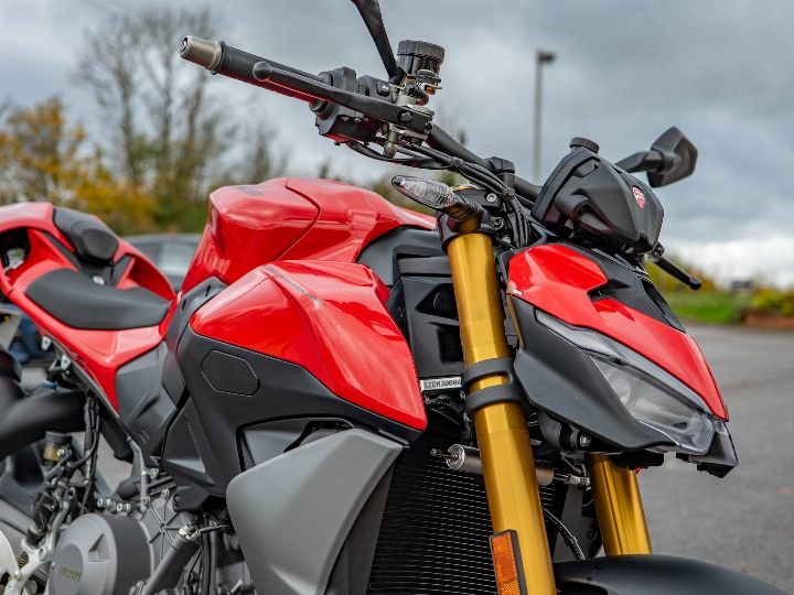 The Streetfighter V2 S is powered by the new generation 890cc 90° V2 engine, a high-revving L-Twin that delivers a thrilling 120 hp and incredible torque throughout the rev range, making for a potent and engaging ride whether on the street or the track. This power is expertly managed by a comprehensive electronics package, featuring Riding Modes, multi-level Traction Control, Wheelie Control, and a lightning-fast Quickshifter for seamless up and down shifts. The "S" model elevates the handling with fully adjustable Öhlins suspension front and rear, giving the rider superior feedback and customisation options compared to the standard model.