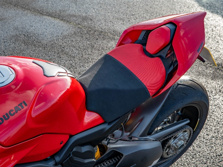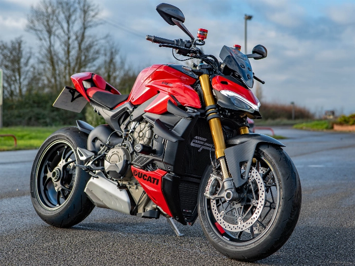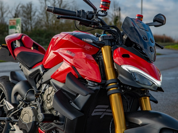 The Streetfighter V4 S is powered by the 1103 cc Desmosedici Stradale V4 engine, producing an incredible 208 hp, and features the essential bi-plane wings for high-speed stability. The 'S' model raises the bar for performance with its fully electronic, semi-active Öhlins Smart EC 2.0 suspension and lightweight forged Marchesini wheels. The motorcycle is fully equipped with Ducati's sophisticated electronic suite, which uses a six-axis IMU to manage features like Cornering ABS, multiple Riding Modes, and the Quickshifter (DQS) up/down for seamless gear changes.