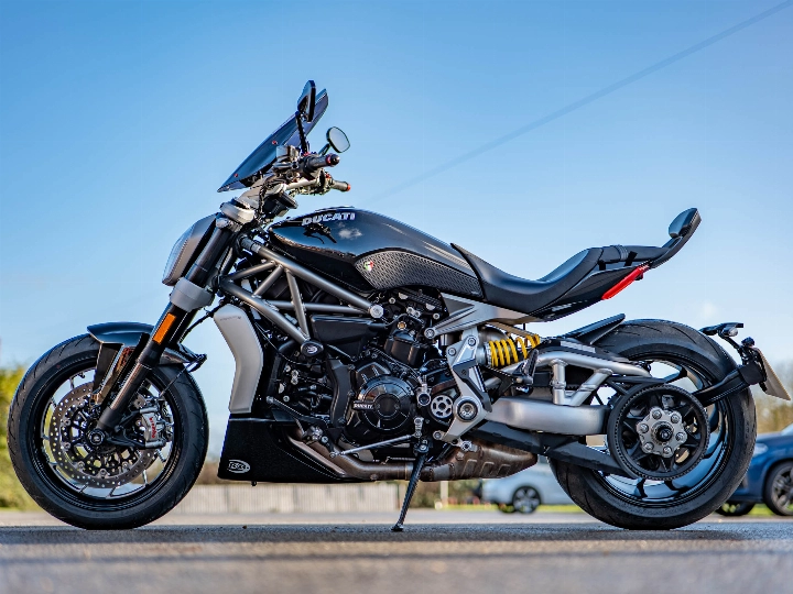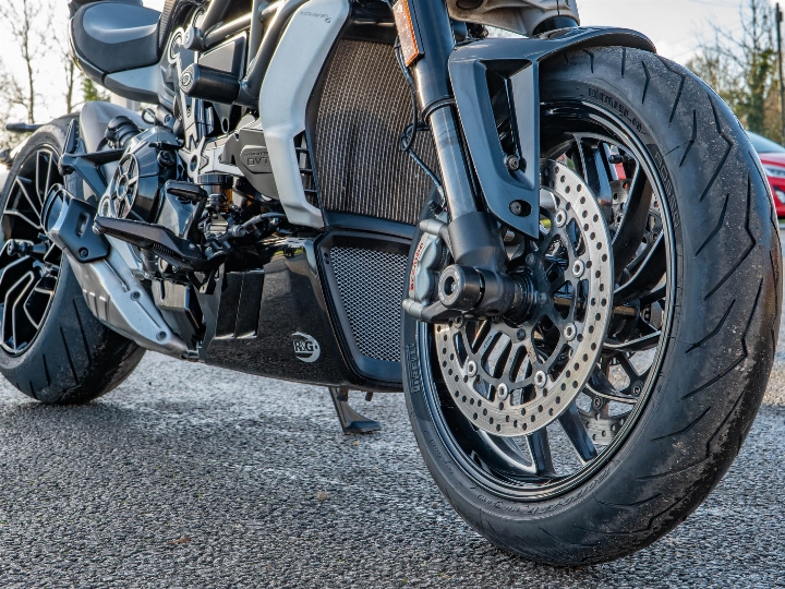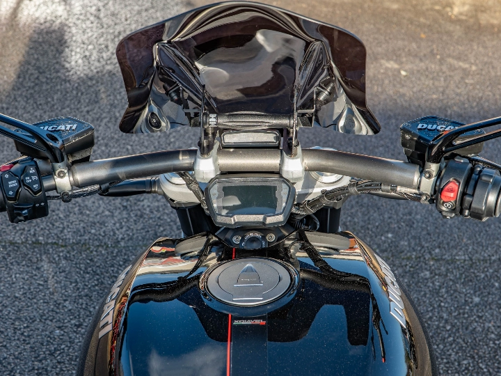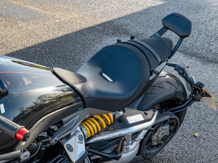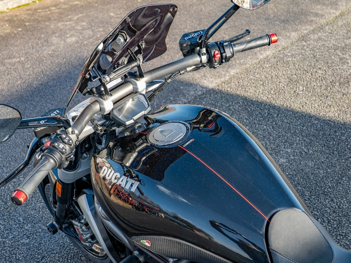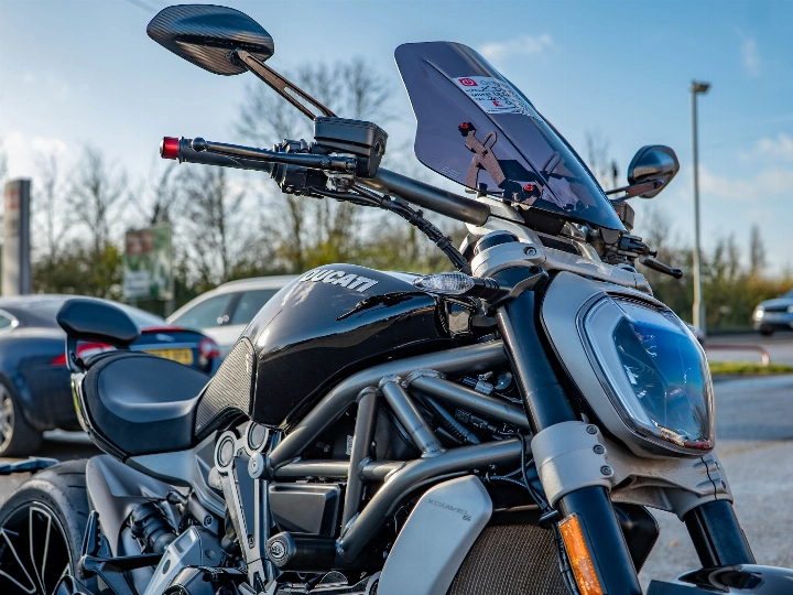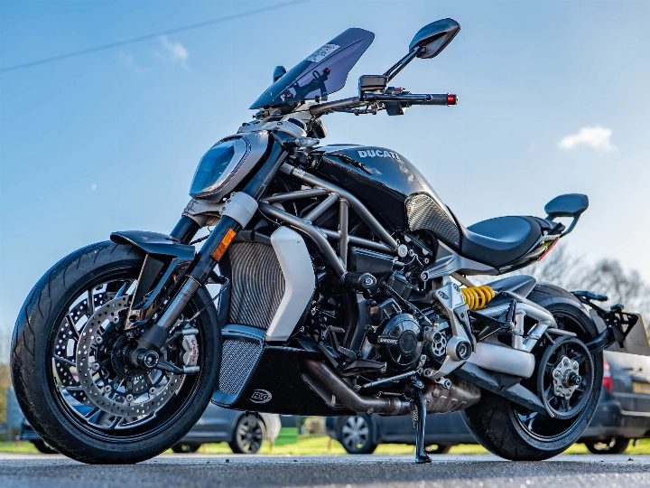 The XDiavel S is a technological masterpiece, featuring Keyless Ride and a sophisticated electronics package governed by an Inertial Measurement Unit (IMU). This enables Cornering ABS, multi-level Ducati Traction Control (DTC), and three selectable Riding Modes (Sport, Touring, and Urban). This particular bike has been enhanced with a neat Tail Tidy to clean up the rear end, along with protective accessories including Crash Bobbins and Spindle Sliders (fork sliders/paddock stand bobbins) for peace of mind. A practical Fly Screen is also fitted to offer a little extra wind protection.